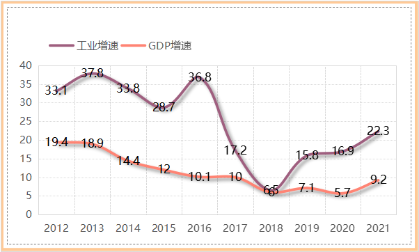 图2 2012-2021年博尔塔拉蒙古自治州GDP增速和工业增速