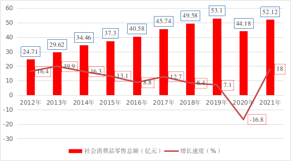 2012年—2021年博州社会消费品零售总额变化情况表
