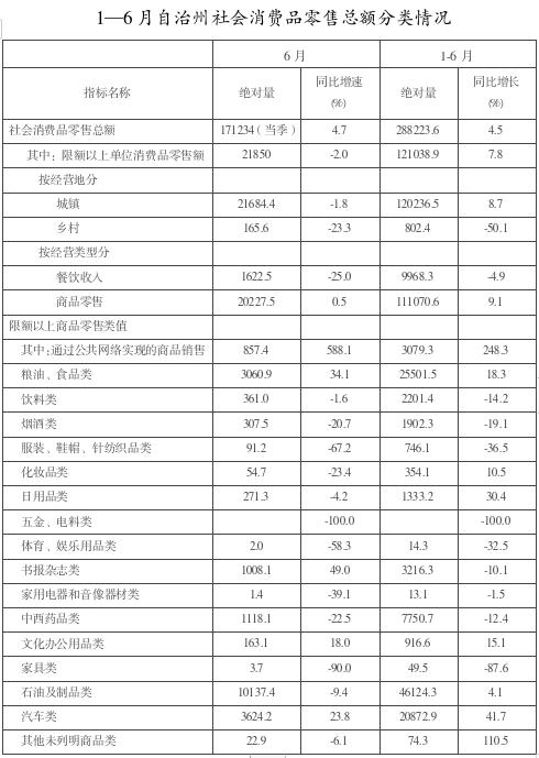 上半年博州依靠自身优势,积极开展各项刺激消费活动、举办各类各种文化娱乐活动,根据自治区审定,博州社会消费品零售总额完成28.82亿元,增长4.5%,增速较一季度提高0.3个百分点。限额以上单位消费品零售额继续保持高增长,全州限上单位实现消费品零售额12.1亿元,同比增长7.8%,增速较1—5月提升0.5个百分点。