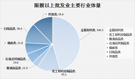 从限额以上批发零售业的产品构成体量来看,从大到小依次为金属材料类(销售额146.5亿元,同比增长51.3%,占限上批发业商品销售额的44.5%)、化工材料及制品类(销售额45.1亿元,同比下降0.7%,占限上批发业商品销售额的13.7%)、石油及其制品类(销售额19.6亿元,同比下降9.2%,占限上批发业商品销售额的5.9%)。