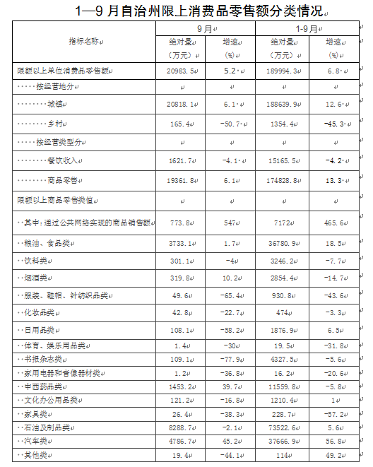 分商品类别看,10类消费品下降,6类商品增长。1—9月,限额以上单位粮油食品类同比增长18.5%;限额以上日用品类同比增长6.5%;文化办公类同比增长1%;石油及制品类同比增长5.6%;汽车类同比增长56.8%;其他类同比增长49.2%。共计拉动全州社零增长8个百分点。