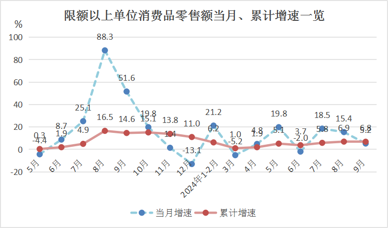 根据自治区审定,前三季度,自治州社会消费品零售总额完成43.5亿元,增长4.8%,增速较上半年提高0.3个百分点。限额以上单位消费品零售额继续保持高增长,限上单位消费品零售额完成19.0亿元,增长6.8%,9月当月完成2.09亿元,增长5.2%,较8月回落10.2个百分点。