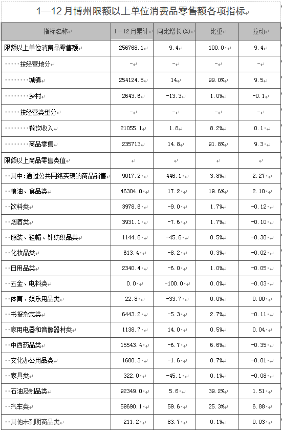 分商品类别看,10类消费品下降,5类商品增长限额以上单位粮油食品类同比增长17.2%;家用电器和音像器材类同比增长14%;石油及制品类同比增长5.6%;汽车类同比增长59.6%;其他类同比增长83.7%。合计拉动全州社零增长12.8个百分点。