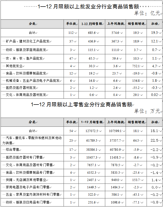 限上批发业大类行业“六增二降”。矿产品、建材及化工产品批发销售额增长18.9%,拉动限上批发业销售额增长12.1个百分点。金属材料下游需求增加拉动上游批发业增长,全年金属及金属矿批发完成210.5亿元,同比增长48.6%,拉动全州批发业增长12个百分点。机械设备、五金产品及电子产品批发销售额增长156.8%,拉动增长1.8个百分点。其他批发类销售额增长752.1%,拉动限上批发业销售额增长4.7个百分点。