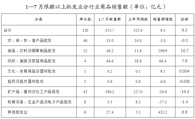 1—7月,全州限额以上批发零售业商品销售额完成364.17亿元,同比增长9.5%,7月当月销售额完成62.12亿元、下降2.8%,增速回落趋势显现。分行业来看,限上批发业商品销售额355.67亿元、增长9.3%;限上零售业商品销售额8.5亿元、增长18.3%。