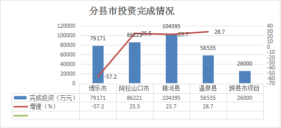 ㈠两县两市“三增一降”。博乐市完成投资7.92亿元,同比下降57.2%,占全州投资总额的22.4%,影响全州投资增长27.6个百分点;阿拉山口市完成投资8.62亿元、增长25.5%,占全州投资总额的24.3%,拉动全州投资增长4.6个百分点;精河县完成投资10.44亿元、增长23.7%,占全州投资总额的29.5%,拉动全州投资增长5.2个百分点;温泉县完成投资5.85亿元、增长28.7%,占全州投资总额的16.5%,拉动全州投资增长3.4个百分点;跨县市项目完成投资2.6亿元,占全州投资总额的7.3%,拉动全州投资增长6.8个百分点。