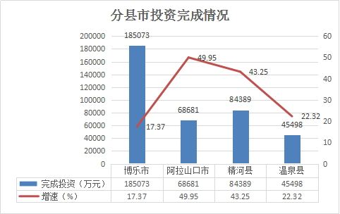 --各县市均实现快速增长。博乐市完成投资18.51亿元,同比增长17.4%,占全州投资总额的48.3%,拉动全州投资增长9.1个百分点;阿拉山口市完成投资6.87亿元、增长50.0%,占全州投资总额的17.9%,拉动全州投资增长7.6个百分点;精河县完成投资8.44亿元、增长43.2%,占全州投资总额的22.0%,拉动全州投资增长8.5个百分点;温泉县完成投资4.55亿元、增长22.3%,占全州投资总额的11.9%,拉动全州投资增长2.8个百分点。