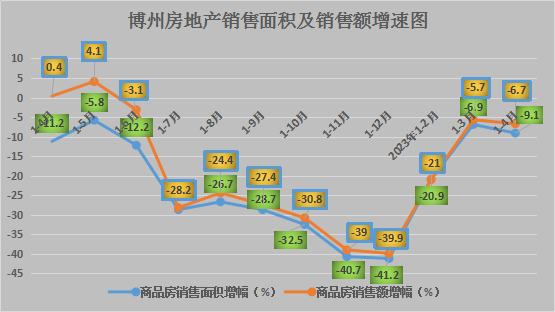 ㈠销售面积、销售额降幅持续低迷后呈回缓趋势。1-4月,博州商品房销售面积9.58万平方米,同比下降9.1%,其中住宅销售面积8.55万平方米,同比下降16.0%;商品房销售额4.08亿元,同比下降6.7%,其中住宅销售额3.45亿元,同比下降15.1%。