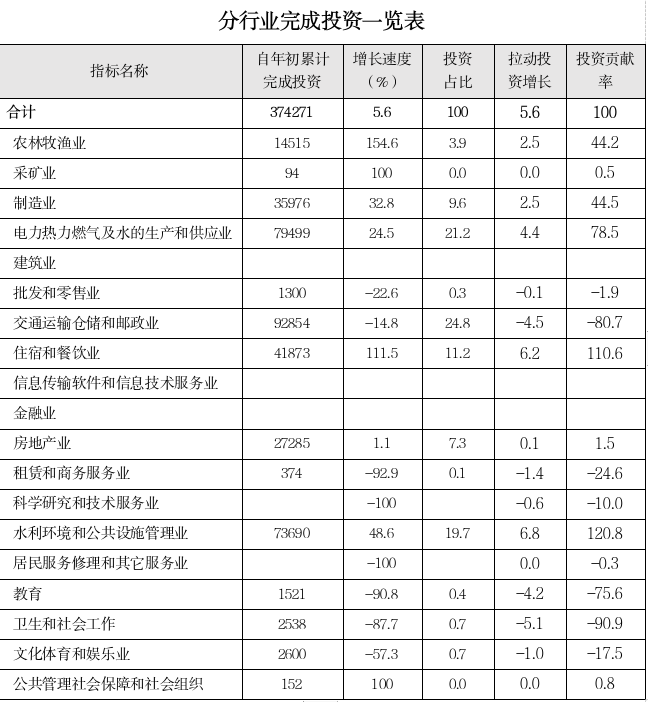 ㈢完成投资涉及16个行业,实现“八增八降”,其中五个行业投资占比六成以上。1—4月,博州农林牧渔业、制造业、电力热力燃气及水的生产和供应业、住宿和餐饮业、水利环境和公共设施管理五个行业累计完成投资24.56亿元,同比增长47.9%,投资占比65.6%,拉动全州投资增长22.3个百分点,投资贡献率398.6%。