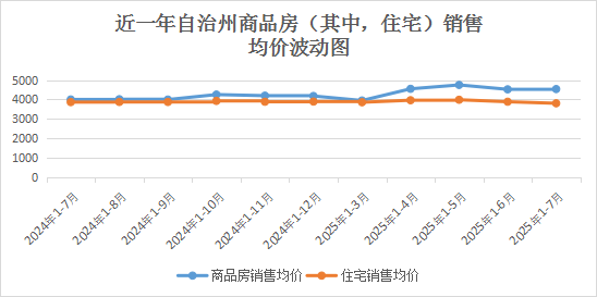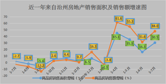 ㈠房地产销售类型转变。1—7月,博州商品房销售面积23.62万平方米、增长30.5%,增幅较1—6月提高14.2个百分点,商品房销售额10.72亿元、增长48.0%,增幅较1—6月提高16.4个百分点。其中,住宅销售面积18.93万平方米、增长25.1%,住宅销售额7.20亿元、增长23.1%;商业营业用房销售面积4.69万平方米、增长86.1%,商业营业用房销售额3.52亿元、增长2.0倍。