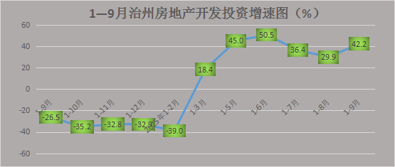 ㈠房地产开发投资持续两位数增长。前三季度,博州房地产开发企业完成投资15.48亿元,同比增长42.2%,增幅较1—8月提高12.3个百分点,拉动全州固定资产投资增长1.7个百分点。其中,住宅投资2.45亿元、下降60.2%;商业营业用房投资12.40亿元、增长2.3倍;办公楼与其他投资0.63亿元、下降37.9%。