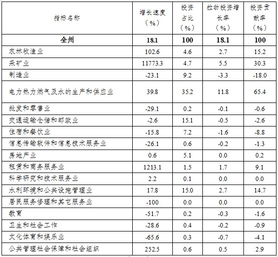 三大行业投资占比六成以上。1—9月,全州电力热力燃气及水的生产和供应业、交通运输仓储和邮政业、水利环境和公共设施管理业三大行业累计完成投资占比65.3%,拉动全州投资增长14.0个百分点,投资贡献率77.6%。