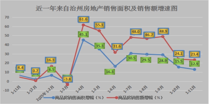 ㈠房地产销售市场仍保持两位数增长。1—11月,自治州商品房销售面积37.09万平方米,同比增长12.9%,较1—10月回落2.6个百分点。其中,住宅销售面积29.25万平方米、增长3.6%,增幅较1—10月回落9.3个百分点。商品房销售额17.01亿元、增长23.4%,较1—10月提高0.7个百分点。其中,住宅销售额11.43亿元、增长4.1%,增幅较1—10月回落8.9个百分点。