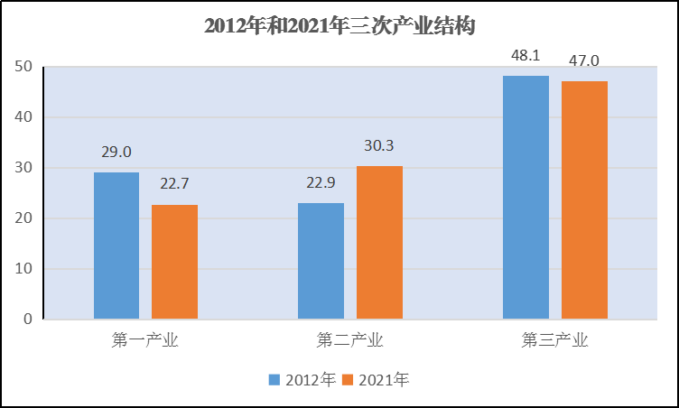 ㈠产业结构由2012年的“三一二”型转变为2021年的“三二一”型。第一产业增加值占GDP的比重由2012年的29%下降到2021年的22.7%,降低6.3个百分点;工业主导型产业结构进一步凸显,第二产业由22.9%上升为30.3%,上升了7.4个百分点;三产发展不断优化调整,第三产业由48.1%略降1.1个百分点,达到47%。