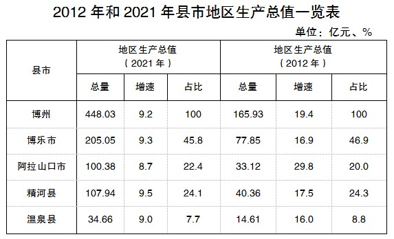 ㈠总量规模扩大,迈上新台阶。博乐市地区生产总值205.05亿元,突破200亿元,占全州总量的45.8%,占比较2012年下降1.1个百分点;阿拉山口市地区生产总值100.38亿元,突破100亿元,占全州总量的22.4%,占比较2012年上升2.4个百分点;精河县地区生产总值107.94亿元,突破100亿元,占全州GDP总量的24.1%,占比较2012年下降0.2个百分点;温泉县地区生产总值34.66亿元,突破30亿元,占全州GDP总量的7.7%,占比较2012年下降1.1个百分点。“口岸强州”战略得到充分彰显。
