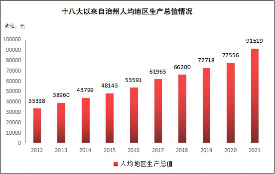 十年时间连续跃上6个万元台阶。2012—2021年,人均地区生产总值年均增长10.3%。2012年全州人均生产总值为33338元,2014年首次突破4万元,达到43799元。2016年首次突破5万元,达到53591元。2017年超过6万元,达61965元;2019年超过7万元,达72718元;2021年超过9万元,达91519元,正在向人均10万元新台阶迈进。按照2021年全年平均汇率折算,人均生产总值超过1万美元,达到14186美元。