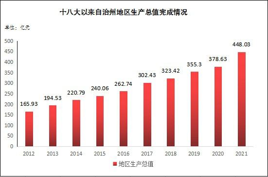 面对复杂多变的国际形势和周边环境以及突如其来的新冠疫情,全州上下克服重重困难,积极转方式调结构,经济总量不断攀升。全州地区生产总值2012年为165.93亿元,十年内相继跨越200亿、300亿、400亿大关,提高到2021年的448.03亿元,总量较2012年增加282.1亿元,按可比价计算,年均增长10.3%。