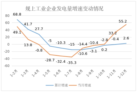 按品种分:火力发电量1—12月累计0.83亿千瓦时、增长8.7%,12月当月0.09亿千瓦时、增长13.5%;风力发电1—12月累计10.38亿千瓦时、下降10.3%,12月当月1.1亿千瓦时、增长113.5%;太阳能发电1—12月累计发电量14.69亿千瓦时、增长13.8%,12月当月0.74亿千瓦时、增长14.4%。